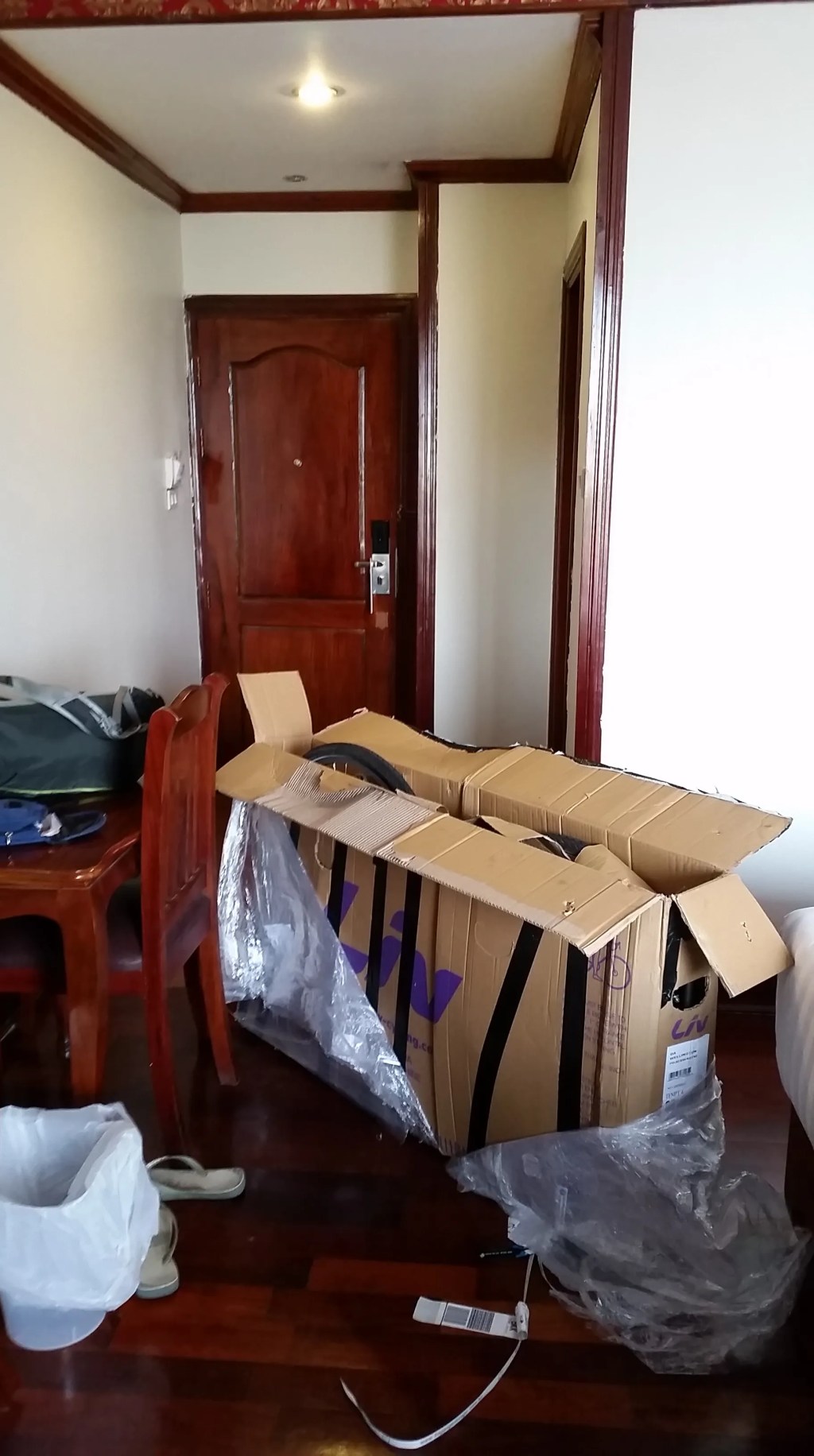 My sense of relief surprises me as I look from the plane and see the familiar bike carton you see in the picture below, moving along the baggage conveyor down to the handlers at Vientiane airport. But the relief is soon tempered as I consider the looming challenge ahead of ‘bike reconstruction for dummies’ without a useful guide. Gavin, my son-in-law, had been a strong encouragement as we reorganised pedals, handlebars and wheels to squeeze Rafiki into what seemed an impossibly small carton. (Small that is until you attempt to manouver aforementioned carton up 3 flights of stairs to a teak-adorned Laotian hotel room.)