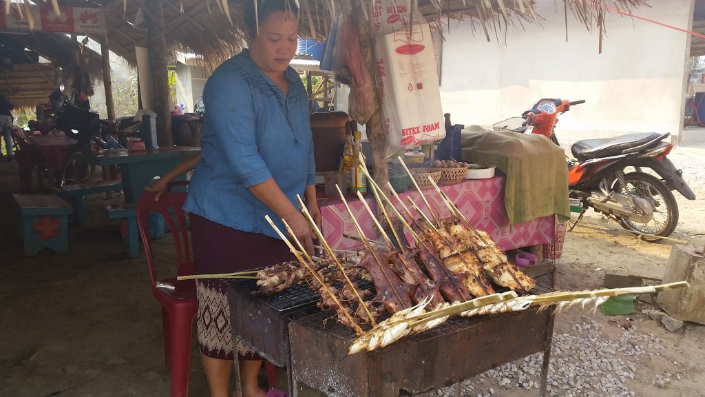 I check into the first guest house, a strange oversize house at the entrance to town, where a group of men are drinking and playing cards in the vast foyer, but after delightedly stripping for a cooling shower in my ensuite bathroom, I find there is no water. Finally with Google translate, it is explained that there will be no water until 9am. I reluctantly pack up my bike, ask for a refund, and go and check if there is any possibility that this tiny town has a second guest house. Fortunately it does, and although I know I am being overcharged – I am asked for 100,000 kip, about $NZ20 – I am past caring. By 6.30pm as darkness falls, I am finally under a restorative cold shower. Later I walk down the street and find what appears to be a café, with two separate groups of young people around tables filled with food. Despite their surprise, they are friendly enough. I point to and am provided with a cold beer, and then Google translate comes to the fore again. “FOOD?” I write, and finding that possible, though I feel sure the cooks are sitting enjoying dinner themselves and probably thought themselves finished for the night. I try to think of something simple: “SOUP?” And 15 minutes later after smiling non verbal communication with both groups, including a little boy of about Harry’s age, my large bowl of herb-filled soup arrives. It’s a restorative and delicious end to ghastly day.
