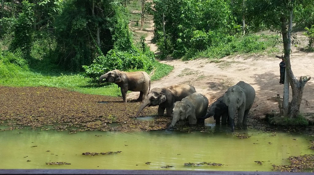 Almost all the funding for this elephant conservation work comes from visitors such as my 3 daughters, 2 small grandsons and myself, who have just spent 3 days together here. Embraced into the culture of the endearing Asian elephant, now sadly endangered, and the passion of those that run this mission, it’s been a special time. This week we’ve followed elephants and their mahouts through the jungle, watched a baby elephant, under the watchful eye of her aunt, swim using her trunk as a snorkel, and lugged banana palms along dusty paths to hide them around a special ‘enrichment’ enclosure, watching three elephants swiftly seek out and crunch through our hidden treasures. We’ve admired giant beetles, tested 4 year old legs to their limit on steep forest tracks, kayaked and swum in the lake, but most of all, deepened our respect for the dignity of these slow-paced animal giants.
