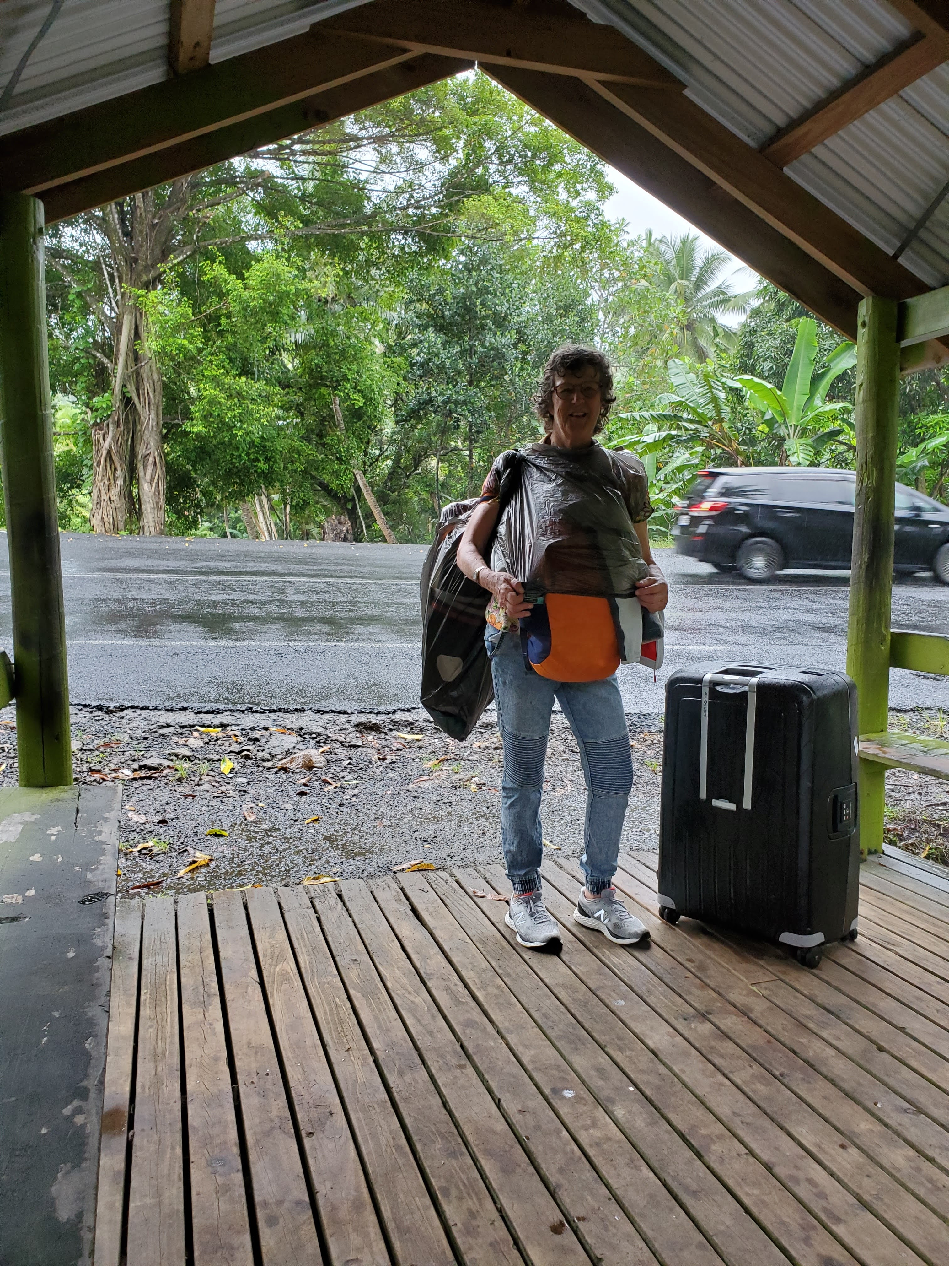 Im sporting a repurposed rubbish bag as I reluctantly take my leave of this delightful resort. The bus hasn’t arrived yet, an hour later than scheduled. My rain jacket is inaccessibly packed so even I have resorted to ‘disposable’ plastic.