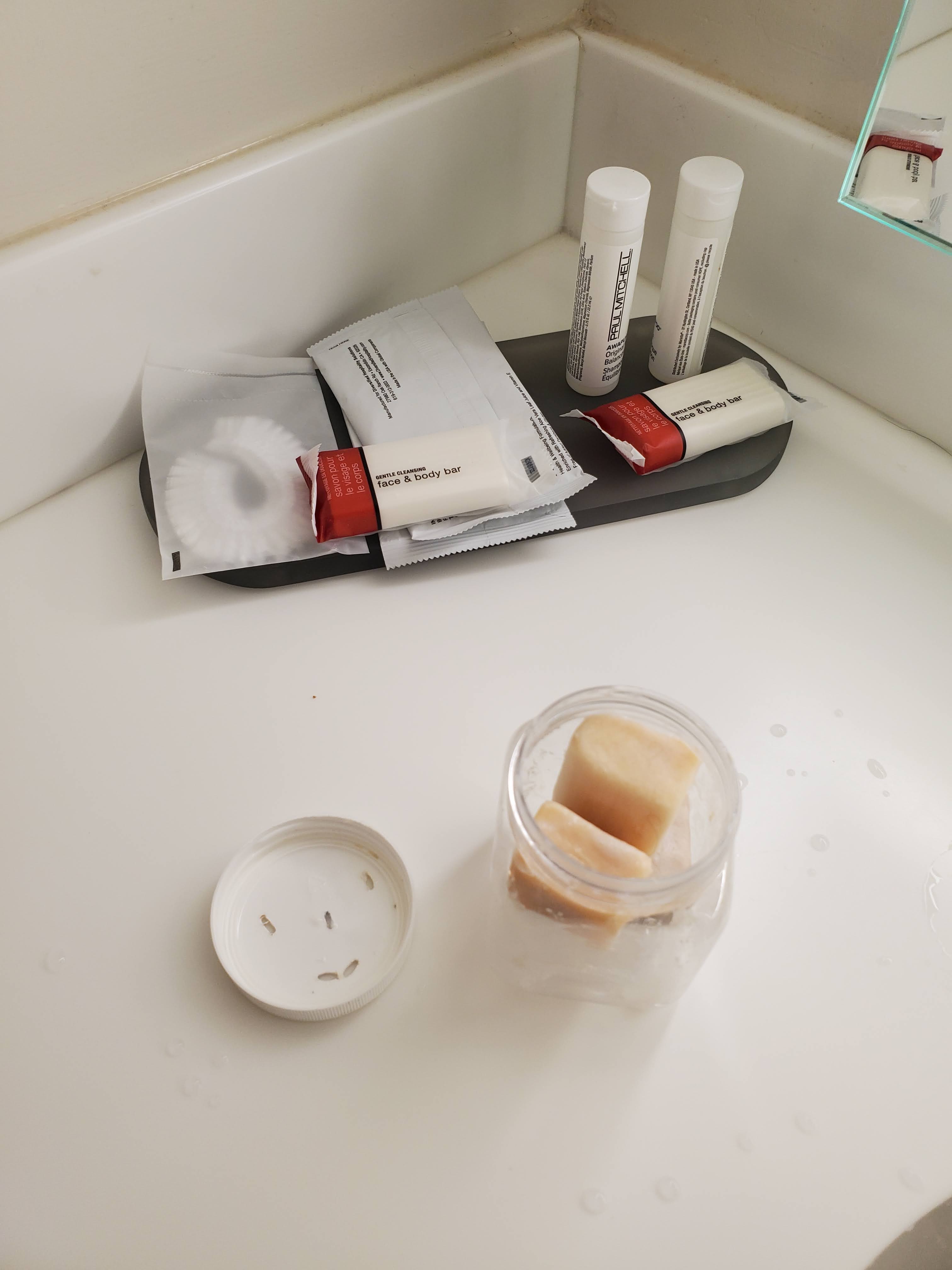 As a ‘zero waste granny’, I aspire to travel in line with my values. Tiny blocks of shampoo and conditioner bars, fit into a recycled tiny honey jar, obviating the need for water-based hair products. There’s a joy in neither carrying shampoo bottles nor using the tiny single-use ‘free’ bottles offered in my bathroom.