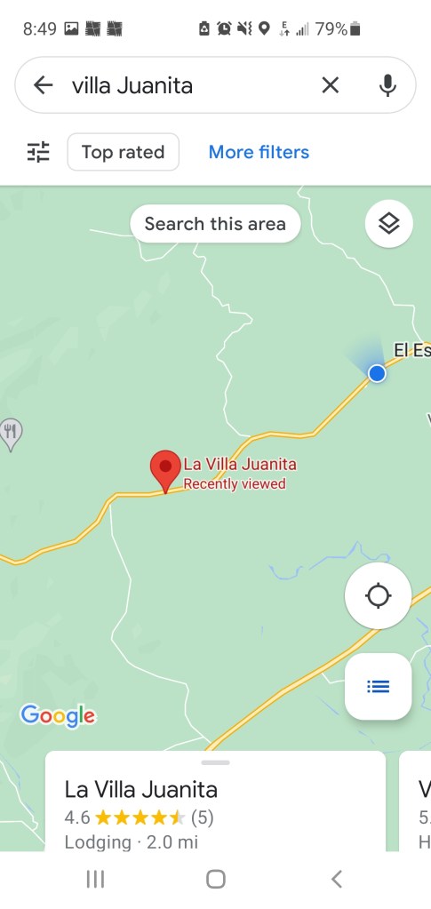 Quite reasonably he suggests, “Just ask anyone. Everyone knows Villa Juanita.” Which may indeed be the case but I am hot, super-weary and here in the midst of this bush-lined road, there is no-one in sight. Ten minutes later, like a spider with web spun, Im still waiting a passing vehicle. When a motorcyclist finally heads towards me, I flag him down: sure enough, he knows the place.