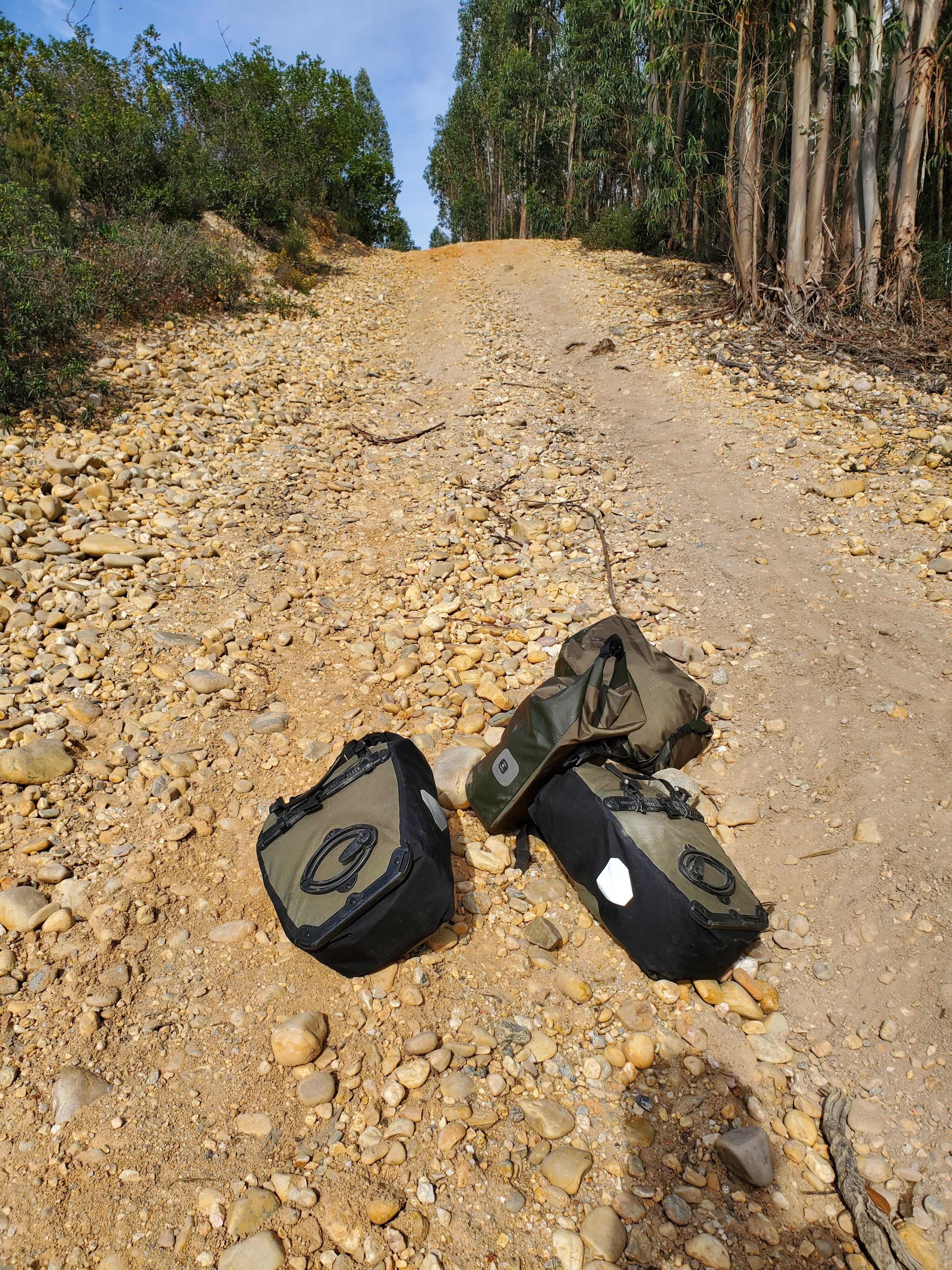 Belongings weight 22kg: Clothes/bike tools/food/1.5l water. 2 Ortlieb back panniers/ 2 Decathlon front panniers /1 Ortlieb handlebar bag