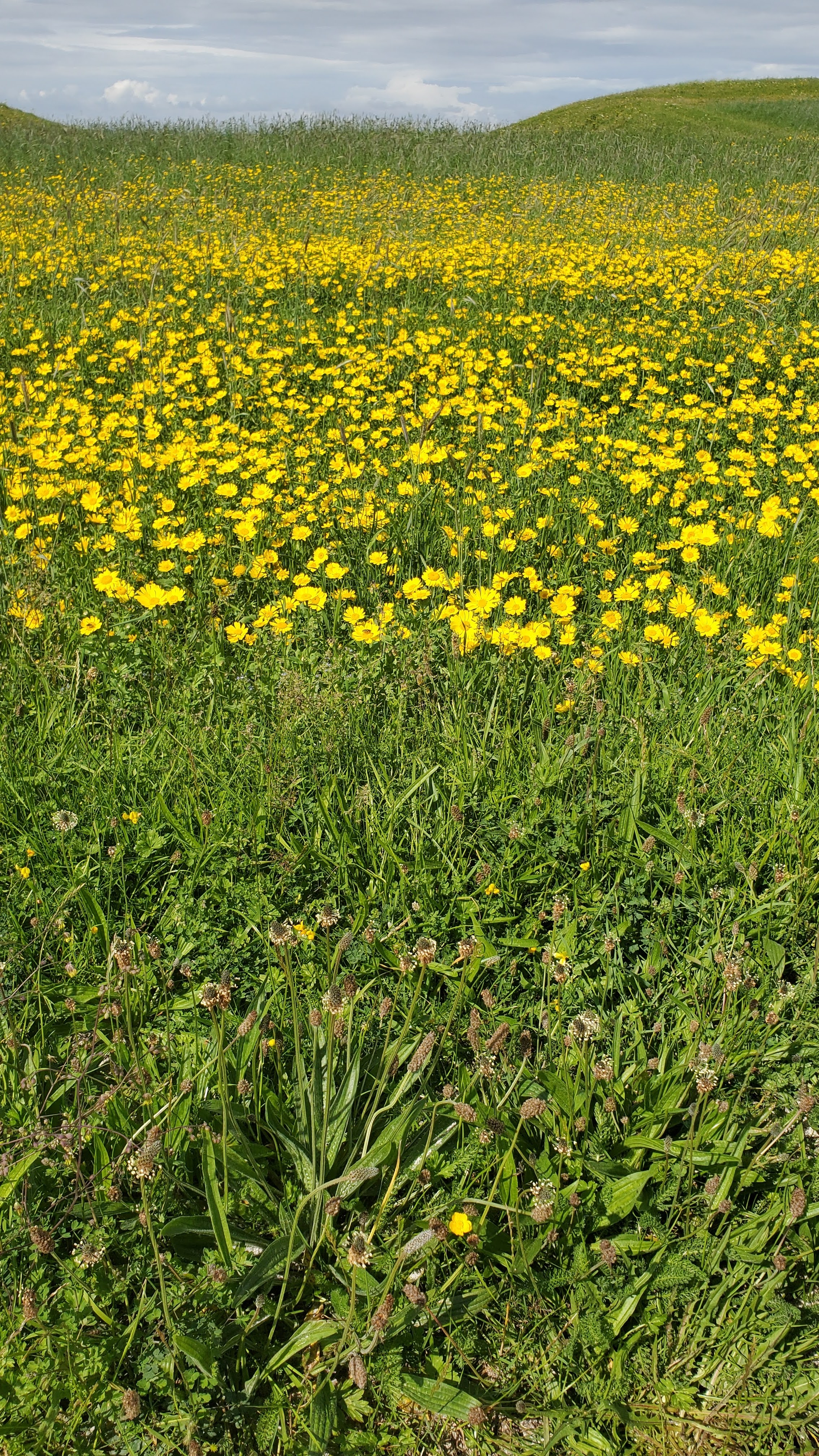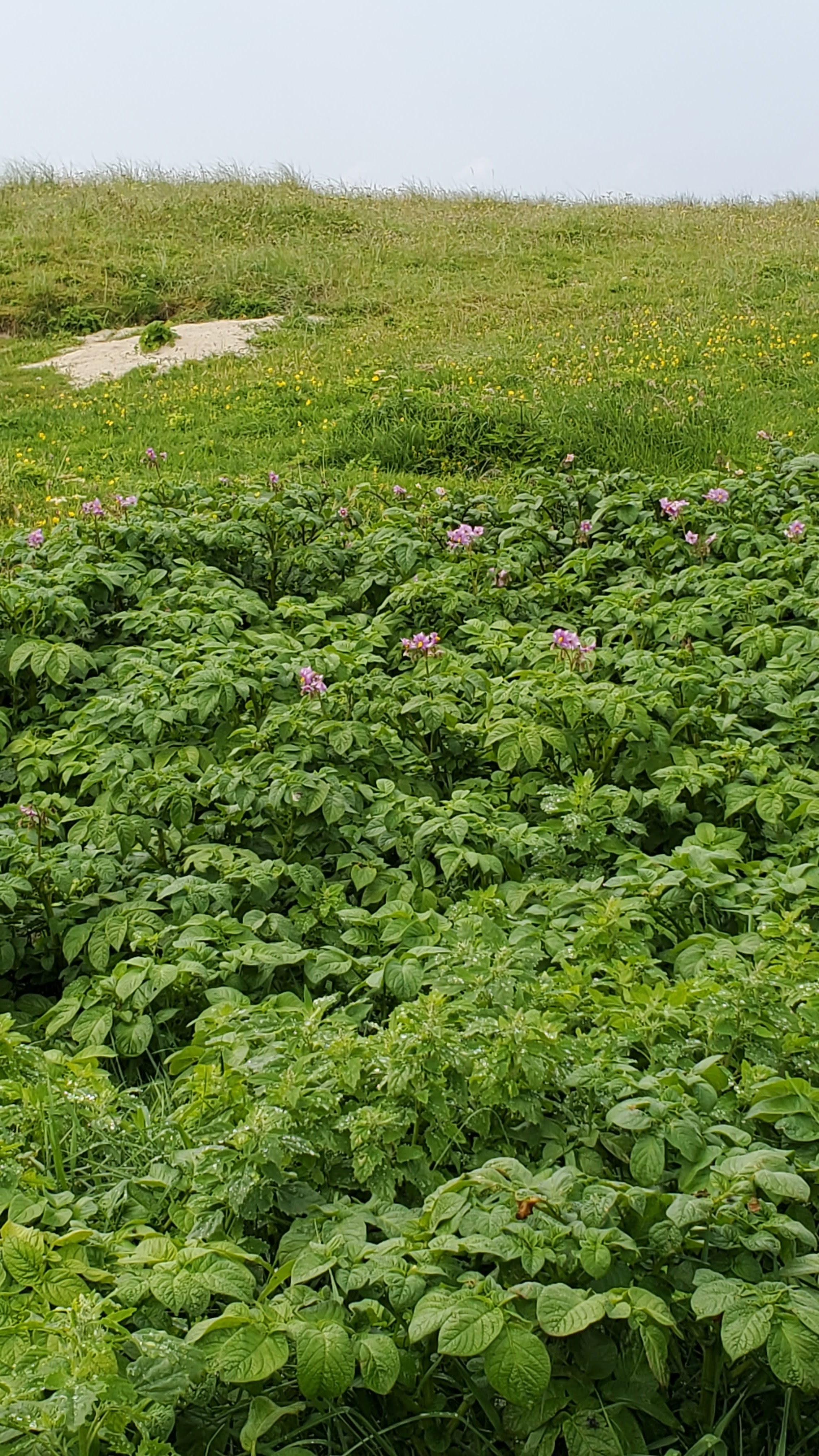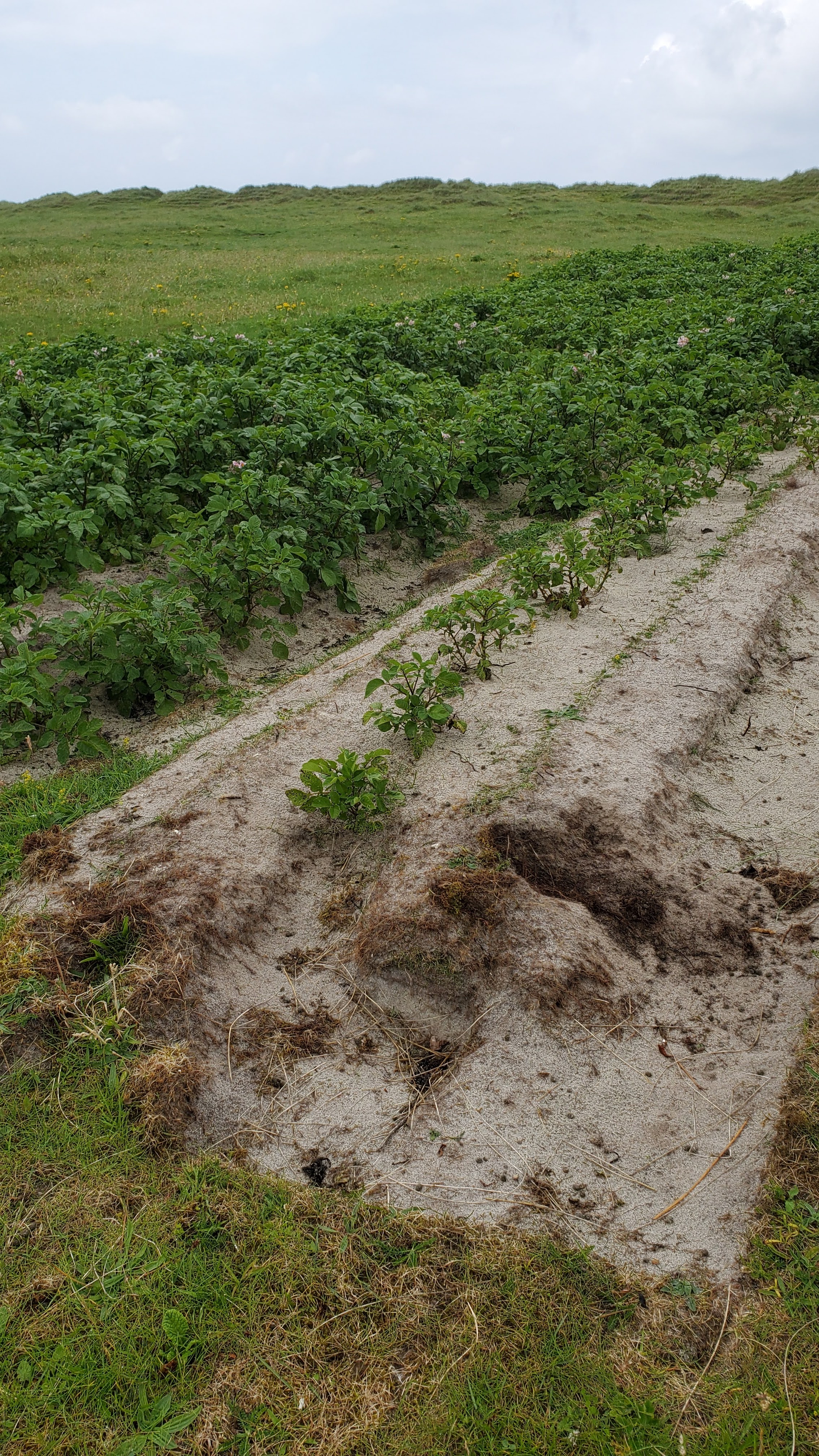 As seems the norm here, the rain shower soon shifts. Cautionary cries from Lapwings and Oystercatchers acknowledge our arrival on the machair. This coastal strip seems a raucous multi-hued dance floor of wild flowers, while fallow cropping areas are brilliant with yellow marigolds. The traditional seaweed-fertilised potato plots, may seem more sombre but they are perhaps simply too busy growing in what looks almost like pure sand to spend time dancing in the breeze.