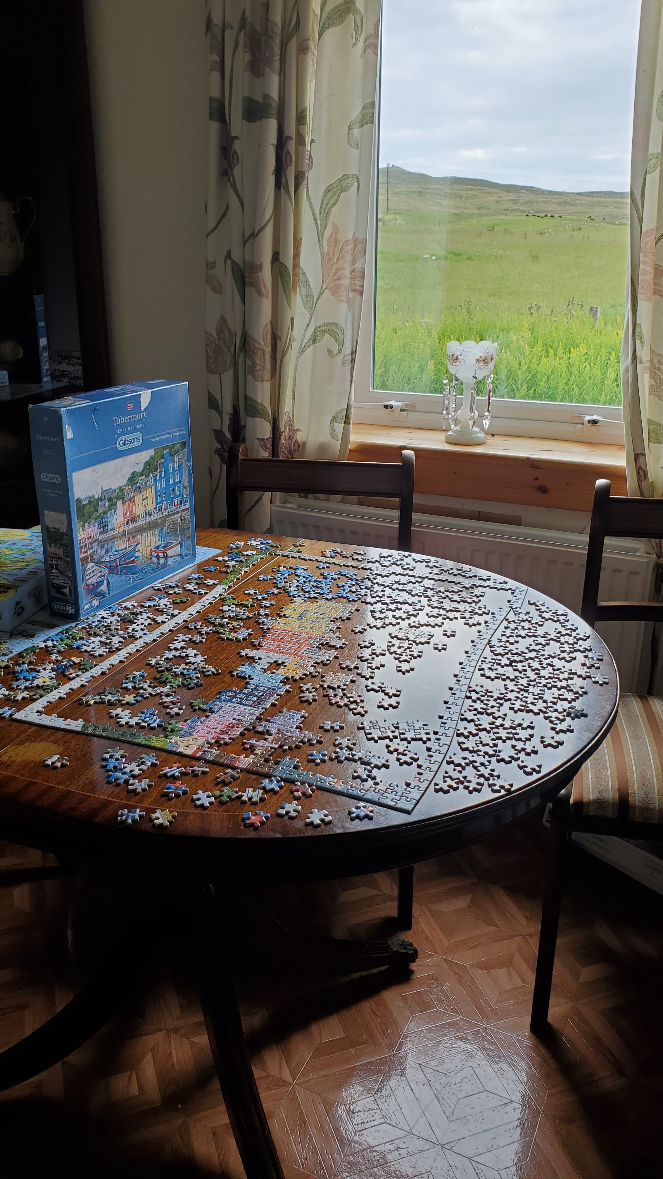 While my host knits (I’ve already been gifted a marvellous pair of made-to-measure stripey socks), or we work together on a jigsaw, I take the opportunity to ask about her early life. I hear of the men in the military camps near the village in WWII, stationed on this close outpost for the north Atlantic shipping route, whose presence brought new improved shops, but also of the exhausting work of harvesting peat. It’s no wonder, I think to myself, that Morag delights in her oil-fired central heating ( and fortunately for me, puts it on some evenings for an hour or two). I’ve walked up to the area of distant moorland hillside where, after several weeks of drying, she and her late husband would take the horse and cart to bring home the cut peat slabs, and seen how big a stack must be to last the winter (curiously once dried, the peat blocks are impervious to rain so at least no cover is needed).
