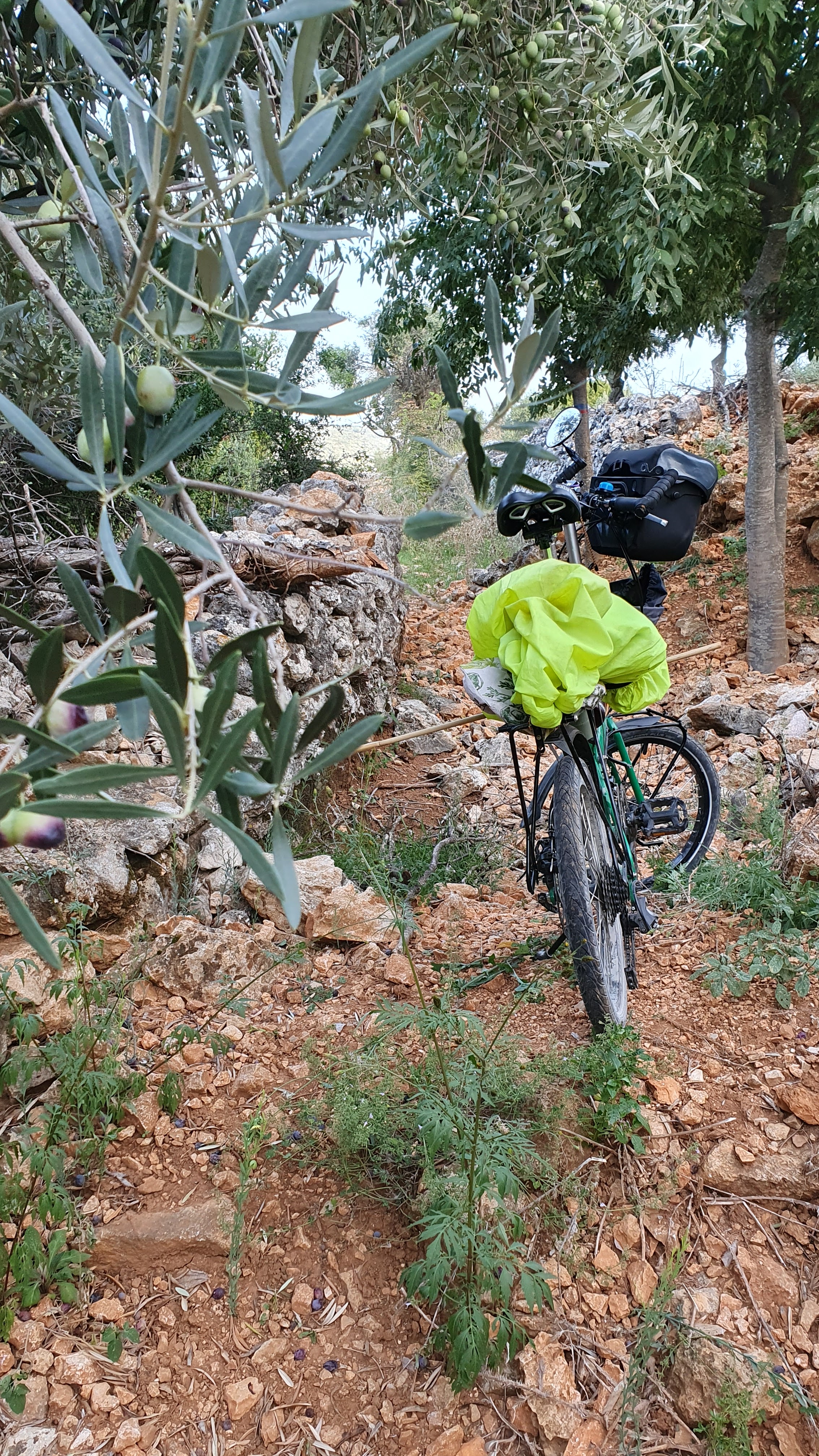 It wasn’t! Three hundred metres up this overgrown path, I’ve had to remove my panniers to lift my bike through a narrow gate. In hindsight that was the signal to turn back but I didn’t! Two hundred metres further on, a high earth bank seems to have been bulldozed over the edge of an olive grove and the path ends abruptly. I hate to ‘admit defeat’ and retracing my steps downhill wont be easy so I decide that if I remove the panniers, I can clamber up the bank with them and carry them through the orcbard to the main road then return and carry up my bike. Fifteen minutes later, unbelievably dusty, scratched by thorns and impaled by my bike pedals and uncomfortably hot, I exit onto the main road, replace the panniers, and head uphill.