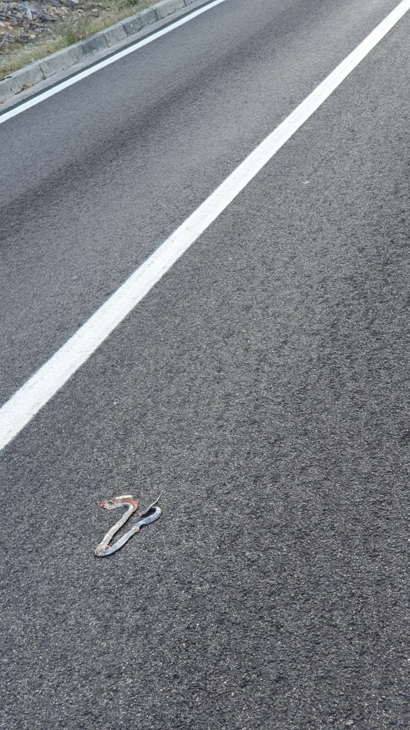 My rejoinder in response to people asking me what cycling is like has been to exclaim,”In the morning I feel 25 years old; by mid-afternoon I feel 85!” That morning, after the portage session, I certainly feel the full impact of my 65 years as I pedal up that hill. The delay has allowed the sun to rise higher so by the time I turn up the road towards the ferry terminal the heat beats down. A further 2km up to the summit takes another 20 minutes of hard climbing, past a snake squahed on the road, so I walk the last kilometre then pause at the summit for a hard-earned drink of water prior to the much-awaited descent.